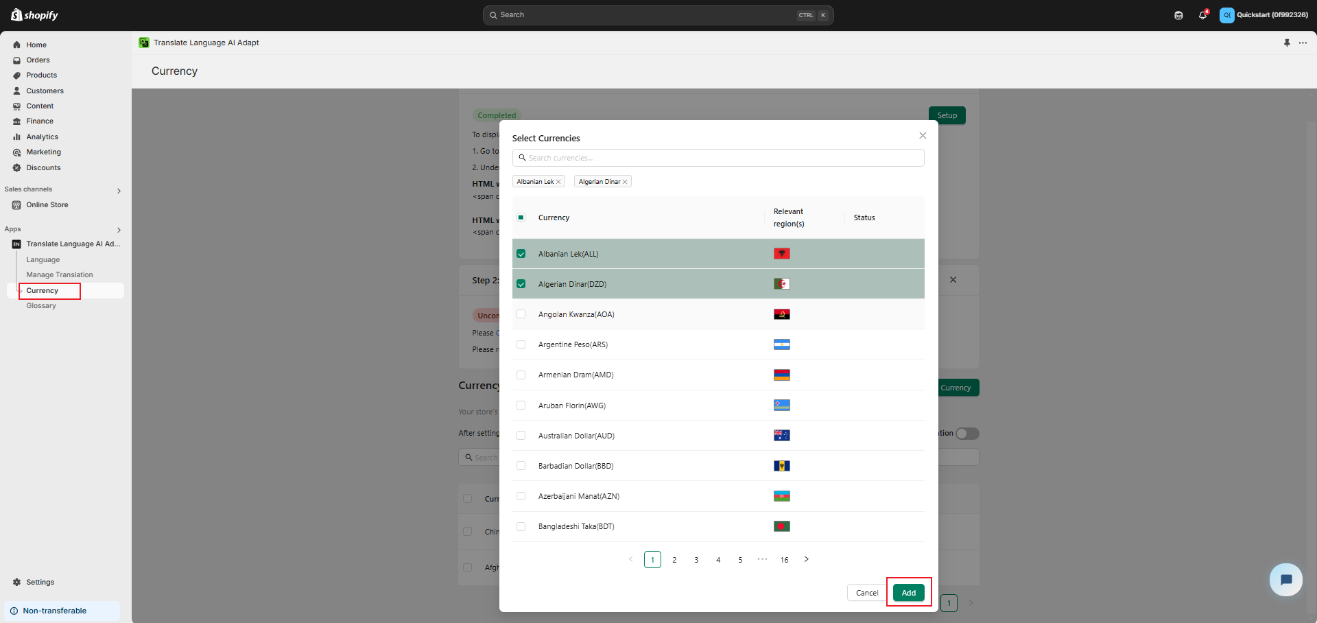 Click on the "Add Currency" button, search and select all the currencies you want to add and click the "Add" button.