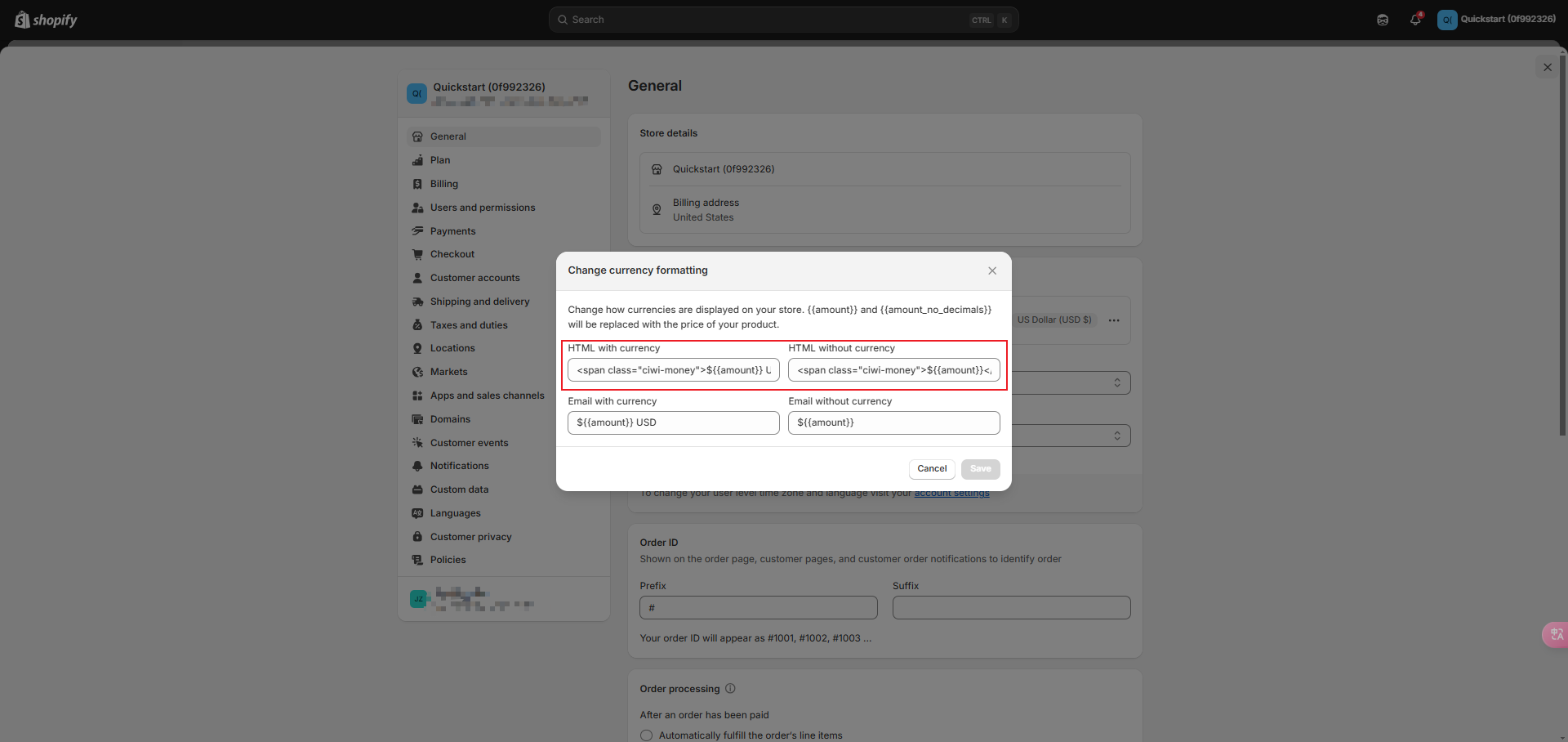 Likewise, copy the second formatting example and paste it into the "HTML without currency" field.