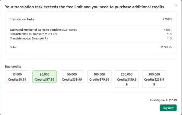 When your credits are used up, clicking the translation button will trigger a "Credit Purchase" pop-up. At this point, you can view the estimated credits required for the translation and choose a suitable credit package for purchase based on your needs.