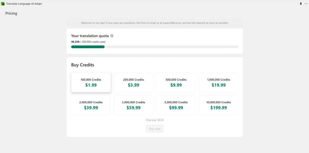 After selecting a suitable credit package, follow the on-screen instructions to complete the payment process. Once the payment is successful, your credit balance will be updated, and you can continue translating.