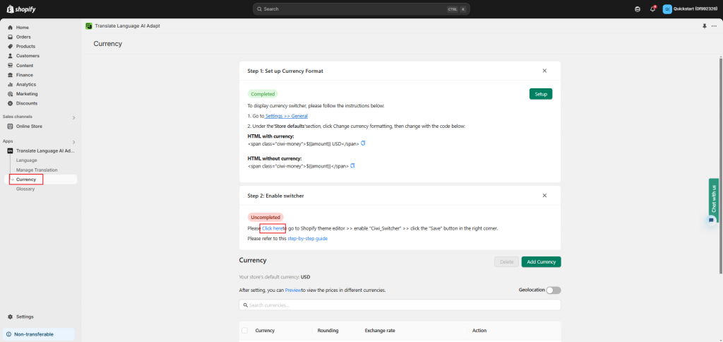 1. Go to Currency page and click "Click here" to enter the Shopify theme editing page.