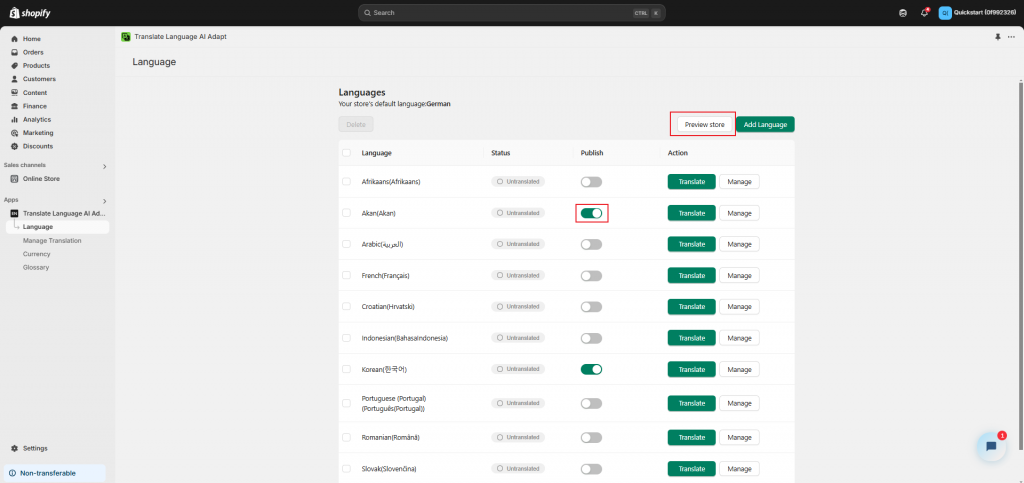 After editing the translation, you need to go to the language page, click the "Publish" button to publish the language to the live store, and then press "Preview" to preview the translated version of the store.